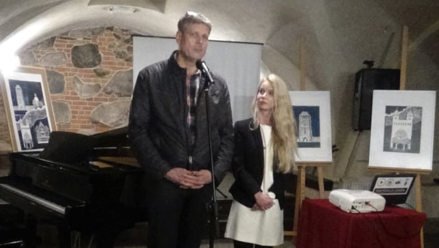 Brama Człuchowska, ratusz i Tur na linorytach młodzieży z Emsdetten i Chojnic