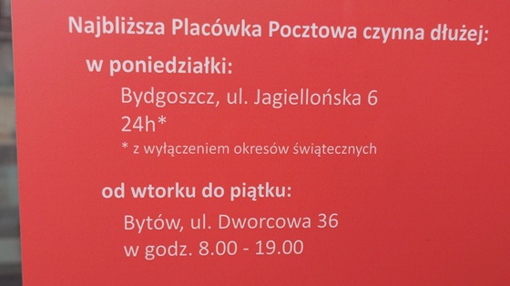 Sprawdziliśmy, jak są czynne placówki Poczty Polskiej w stolicy powiatu chojnickiego. Ta na Starym Rynku od poniedziałku do piątku od 10.30 do 16.30, w soboty 9-13; w blaszaku i na Towarowej niedaleko dworca w poniedziałki 14-20, wtorek – piątek 10.30 – 16.30, w soboty nieczynne. Jeśli ktoś miałby bardzo pilną potrzebę skorzystania z usług Poczty Polskiej poza tymi godzinami i dniami, to ta firma informuje, że można podjechać do Bytowa, gdzie poczta jest czynna od wtorku do piątku w godzinach 8-19; albo w Bydgoszczy na Jagiellońskiej całodobowo. Są jeszcze w naszym mieście partnerskie placówki m.in. sieci Żabka i ABC, gdzie można nadać i odebrać przesyłki Pocztexu.