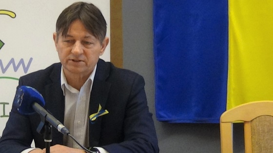 Wójt Zbigniew Szczepański podczas dzisiejszej (25.02) konferencji prasowej miał w klapie marynarki wpięte wstążeczki w barwach flagi Ukrainy, a przy budynku Urzędu Gminy tymczasowo flagę UE zastąpiła flaga naszego wschodniego sąsiada. Także we wnętrzu salki konferencyjnej była flaga Ukrainy.