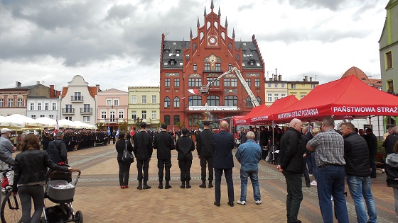 Ostatnim punktem uroczystości były przemówienia gości. W imieniu samorządowców z powiatu chojnickiego gratulacje strażakom w dniu ich święta złożył burmistrz Chojnic Arseniusz Finster. Poseł Aleksander Mrówczyński zapewnił strażaków, że przy nich czuje się bezpiecznie. Przypomniał, jakie od 2015 roku przyjęto rozwiązania prawne wspierające Straż Pożarną, ile pomocy materialnej i sprzętowej dotarło do jednostek PSP i OSP. Przekazał, że wraz z władzami miasta zabiega o budowę nowej siedziby komendy Policji, wtedy po przeprowadzce strażacy przy ul. Gdańskiej w Chojnicach pozyskają więcej terenu. Natomiast wicewojewoda Mariusz Łuczyk, który także wspomniał o dokonaniach „prostrażackich” rządu, przekazał zgromadzonym na płycie Starego Rynku strażakom, że mają dwóch patronów: - Religijnym jest św. Florian, natomiast świeckim poseł Aleksander Mrówczyński.