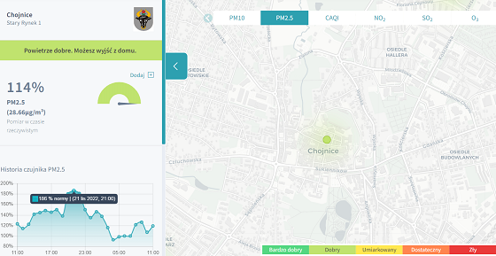 Link do panelu z czujnikami jakości powietrza jest umieszczony na stronie UM Chojnice w dziale Środowisko/Jakość powietrza. Niechlubne I miejsce zajął czujnik przy ul. Jabłoniowej 45 (świetlica osiedlowa). Norma dla pyłów zawieszonych o średnicy poniżej 2,5 mikrometra (PM2,5) o g.14 była przekroczona o 395%, o g.20 422%. Analogicznie dla PM10 było 307% i 344%. Na drugim miejscu uplasowało się osiedle Kolejarz (ul. Wojska Polskiego 45). Wynik dla PM2,5 o g.18 wynosił 303% normy, dla PM10 249%. „Brązowy medal” przypadł w dzisiejszym badaniu miernikowi przy ul. Bałtyckiej 1, czyli MODRAK przy osiedlach Bursztynowym i Hallera. O godzinie 21.00 dla PM10 norma była przekroczona o 200%, a dla PM2,5 o 250%. Natomiast na Starym Mieście (Stary Rynek 1, czyli ratusz) były lepsze wyniki, niż w pobliżu największych „blokowisk”. Tam o g.21.00 PM2,5 było 186%, a PM10 155%.