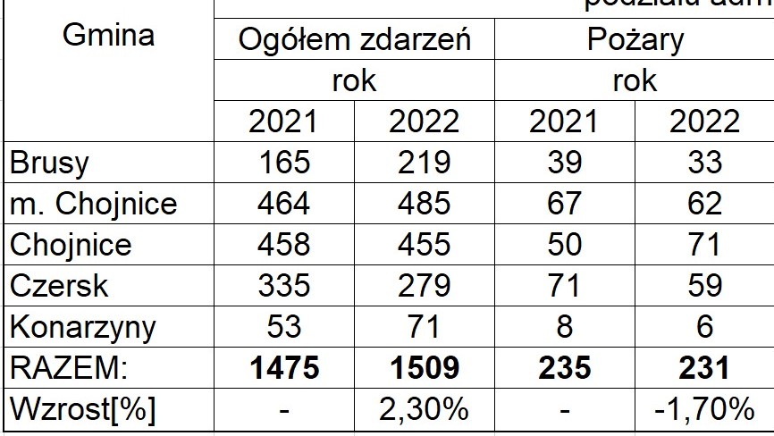 KP PSP w Chojnicach odnotowała następującą ilość zdarzeń na terenie powiatu chojnickiego w 2022 roku (w nawiasie rok 2021): pożary – 231 (235); miejscowe zagrożenia – 1242 (1210); alarmy fałszywe – 36 (30). Razem zdarzeń – 1509 (1475).